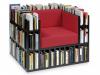 Praktyczny, a jednocześnie zabawny, pomysł na przecho- wywanie książek - mebel typu "dwa w jednym". Fotel w małej bibliotece lub mała biblioteka w fotelu