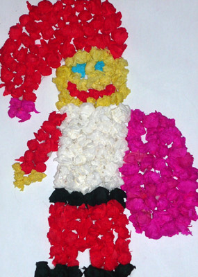 Tata napisał: Portret Mikołaja zrobił mój 6 letni syn Piotrek. Ponieważ nie mógł się zdecydować na jedną połączył ze sobą kilka technik: czapka i prezent z kulek z bibuły, broda z waty, buzia z plasteliny a tło pomalowane kredką.