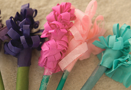 - Karbowaną kolorową bibułę i bibułę zieloną
