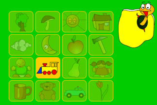 Ćwiczymy pamięć. Na planszy podświetlają się kolejno rysunki. Najpierw tylko jeden, potem dwa, trzy i tak dalej.